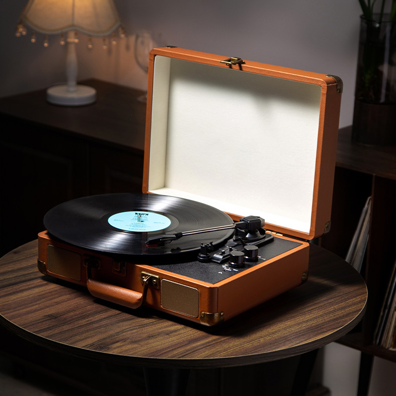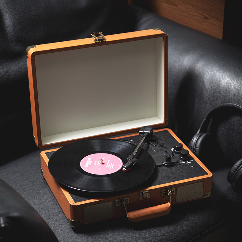 Housed in a genuine leather suitcase with portable design, this all-in-one turntable requires no additional equipment. With auto-stop function and simple controls, it's perfect for both vinyl beginners and enthusiasts seeking authentic sound with modern convenience.