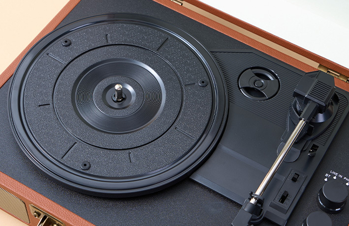 Experience pure analog warmth with our 3-speed belt-driven turntable. Featuring a ruby stylus cartridge and anti-vibration motor system, it plays 7", 10", and 12" records including colored vinyl with exceptional stability and minimal record wear.