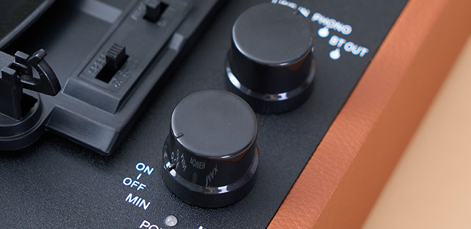 Simple Controls: Input selection, power/volume knob, and auto-stop switch